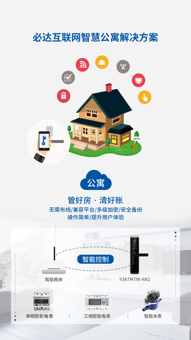 針對以上難題,必達互聯(lián)網(wǎng)智慧公寓解決方案通過對門鎖的管理,實現(xiàn)對出租屋房間出入狀態(tài)實時監(jiān)管,有效預(yù)防偷竊等安全問題,還通過接入智能水電表,監(jiān)控水電花費,致力做到房東少操心,住客好放心。